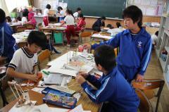 6年生は、家庭科の授業でナップザックやトートバッグを作っていました。友達と教え合いながら、ミシンを使っていました。完成も間近です。