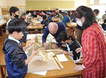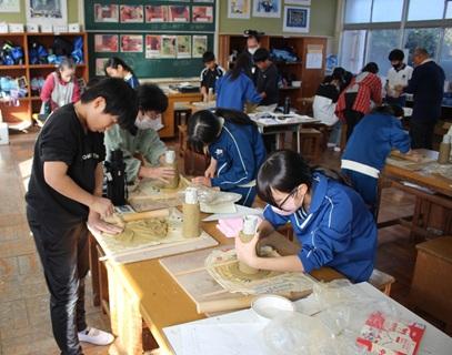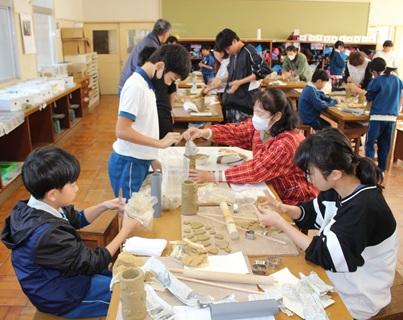 12月8日(月)午前、5年生の学級が、「陶芸教室」を行いました。地域で陶芸サークルとして活動している方々に花瓶の作り方を教えていただきました。子どもたちは、粘土をしっかりと練ってから棒を使って伸ばして、形を作っていきました。自分で考えきた飾りデザインを丁寧に書いたり、貼り付けたりして自分だけの花瓶を作りました。この後、しばらく乾燥させてから焼いてもらいます。どんな花瓶に仕上がるか楽しみですね。