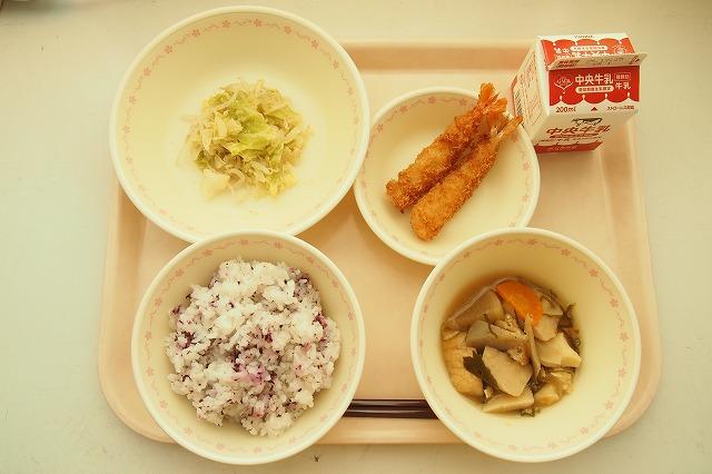 【ゆかりごはん 牛乳 大つごもりのごっつおう えびフライ セロリのごま酢あえ】