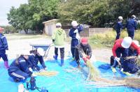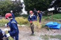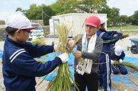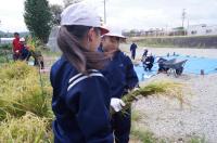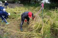 5年生が「きよ田んぼ」の稲刈りをしました。みんなで力を合わせて鎌で刈り、わらで縛って干しました。10月7日に脱穀をする予定です。