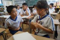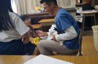 3,4年生は、指先の感覚で文字が読めることを知り集中して触っていました。点字の打ち方を知り少し読めるようになったようです。