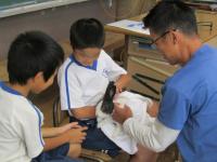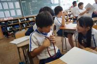 3年生は、ウサギのうしうしを大切に飼育しています。獣医さんから、ウサギのことを学びました。ウサギの心臓の音と人間の心臓の音を聴診器で聴き比べました。速さの違いに驚いていました。