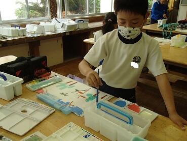 白のクレヨンで描いたあとに、絵の具で色をつけます。