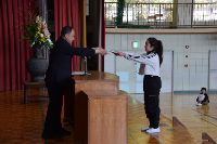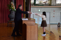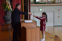 4月15日(火)に先生方をお迎えして退任式を行いました。代表児童からは手紙と花束が手渡されました。