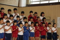 今朝は音楽集会がありました。今まで2つの学年が一緒に歌を発表する音楽集会でしたが、今回からは全校で一緒に歌うことになりました。今回は、校歌と10月の歌「ラララミュージック」を歌いました。子どもたちは、気持ちよさそうに元気よく歌っていました。続けて、夏休みの作文や校外活動に関わる表彰も行われました。