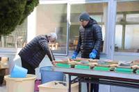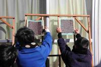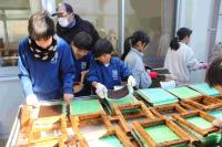 翌日3日(火)には、海苔すきを行いました。長い海苔を漁師さんたちが細かくしてくれたものを海苔すきしました。その後、遠心分離機で脱水し、できあがったものを順番に干し、全部で400枚くらいできあがりました。子どもたちは、夢中になって黙々と取り組んでいました。海苔が乾いてくるとするパキパキという音や磯の香りなど、五感で感じながら作業をしていました。