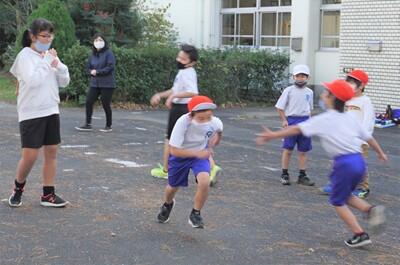 5年生が2年生の準備運動を手伝ったり、走るときの周回数を数えてあげたりました。