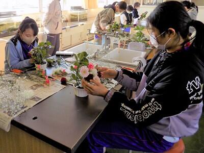 3、4時間目に、5年生が花育の学習で、日本フラワーデザイナー協会愛知県支部の方々に教えていただきながら、フラワーアレンジメントを行いました。
