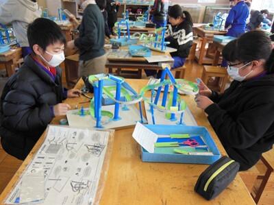 高さの違う柱を何本か立て、それをレールでつなげます。ジェットコースターのようにレールをつなげ、そのレールに沿ってビー玉を旅させる工作です。子どもたちは、玉の転がり方を試しながらコースを工夫したり、転がると面白いコースや仕掛けを考えたりしていました。