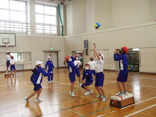5年生は、体育の授業で「テニピン」を行っています。各自が段ボールで作ったラケットを手にはめて、スポンジのボールを使って、テニスのように打ち合います。