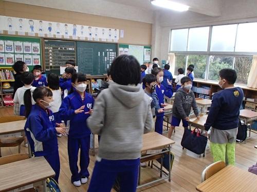 朝の活動の時間に、6年生に贈る歌『ビリーブ』の手話を、5年生が、1~4年生に教えています。