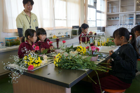 今日は、5年生が「JAあいちみなみ」と「フラワーデザイナーズアソシエーション」の皆さんのご協力により、アレンジフラワーに取り組みました。リンギク、ピンポンマム、アルストロメリア、カーネーション、かすみ草、レザーファンなど7種類の花を花材として使いました。講師の先生の話をよく聞き、花の色や高さのバランスを考えて活けました。それぞれ個性のあるアレンジフラワーに仕上がりました。