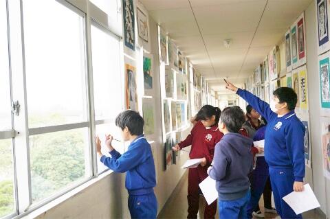 3年生の子ども達は図工の時間をつかって、展示されている作品を鑑賞しました。「花が大きくかいてあってじょうずだね」「にじみや色の組み合わせがきれいだね」「エジプトの背景がとっても上手」など、どこが素晴らしいのかを見つけて鑑賞カードに書いていました。