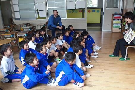 子どもたちは質問された物がどこにあるか、英語で答えることができていました。