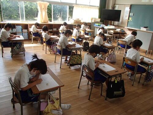 今日は、1、2、3、6年生と2組で、漢字チャンピオンテストが行われました。最後まで丁寧に書いていました。