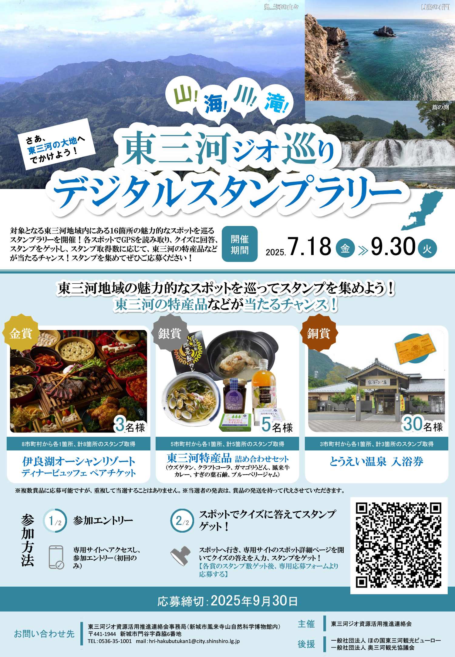 東三河ジオ資源活用推進連絡会が主催する「東三河ジオ巡りデジタルスタンプラリー」のチラシです。7月18日(金)から9月30日(火)に開催されます。 |