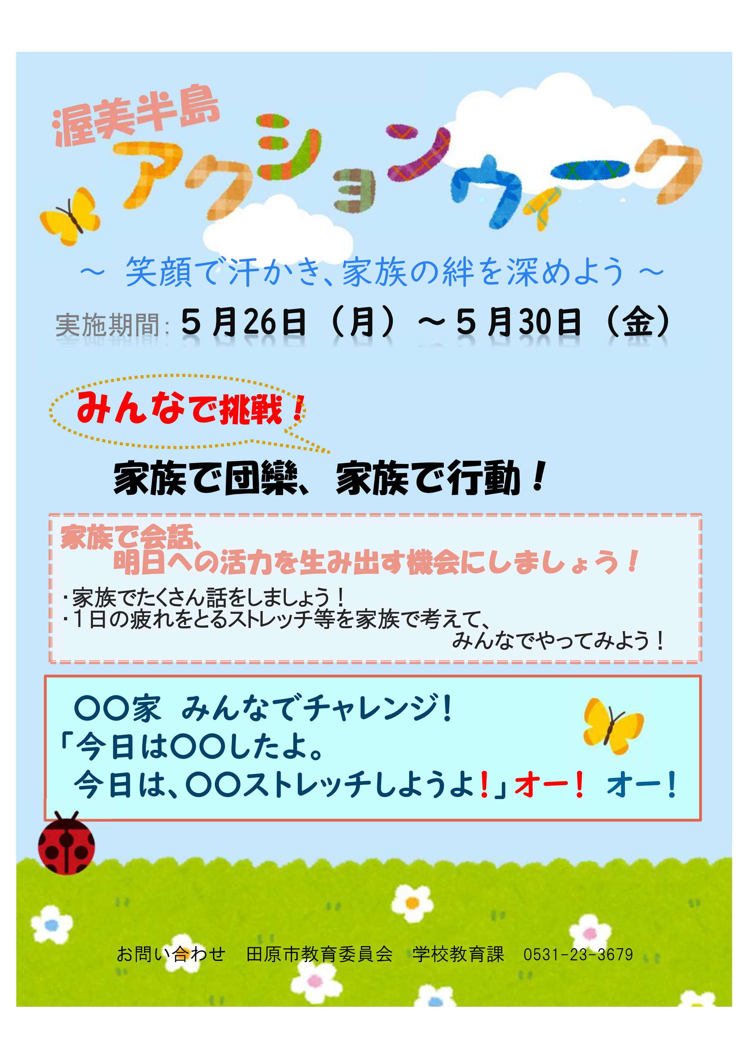 田原市教育委員会が取り組んでいる「渥美半島アクションウィーク」のチラシです。実施期間は5月26日(月)~30日(金)です。 |
