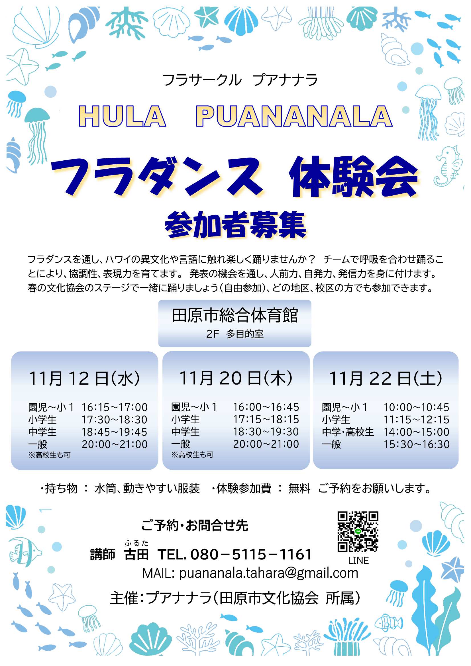 田原市文化協会のプアナナラが主催する「フラダンス体験会」のチラシです。令和7年11月20日(木)、11月22日(土)に田原市総合体育館にて開催されます。