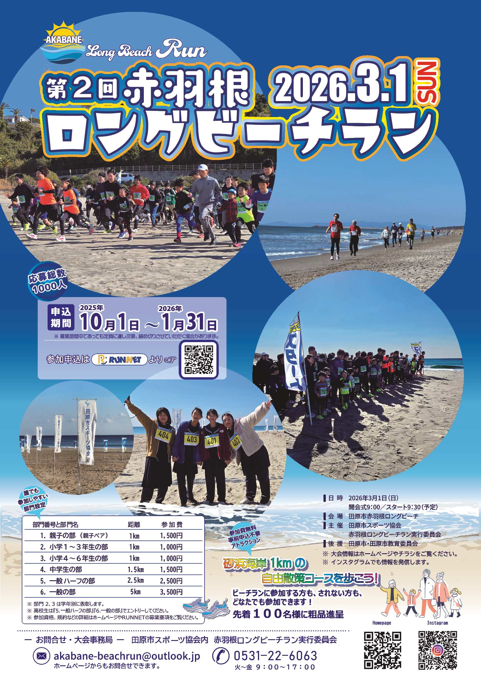 田原市スポーツ協会、赤羽根ロングビーチラン実行委員会が主催する「第2回赤羽根ロングビーチラン」のチラシです。令和8年3月1日(日)に赤羽根ロングビーチにて開催されます。