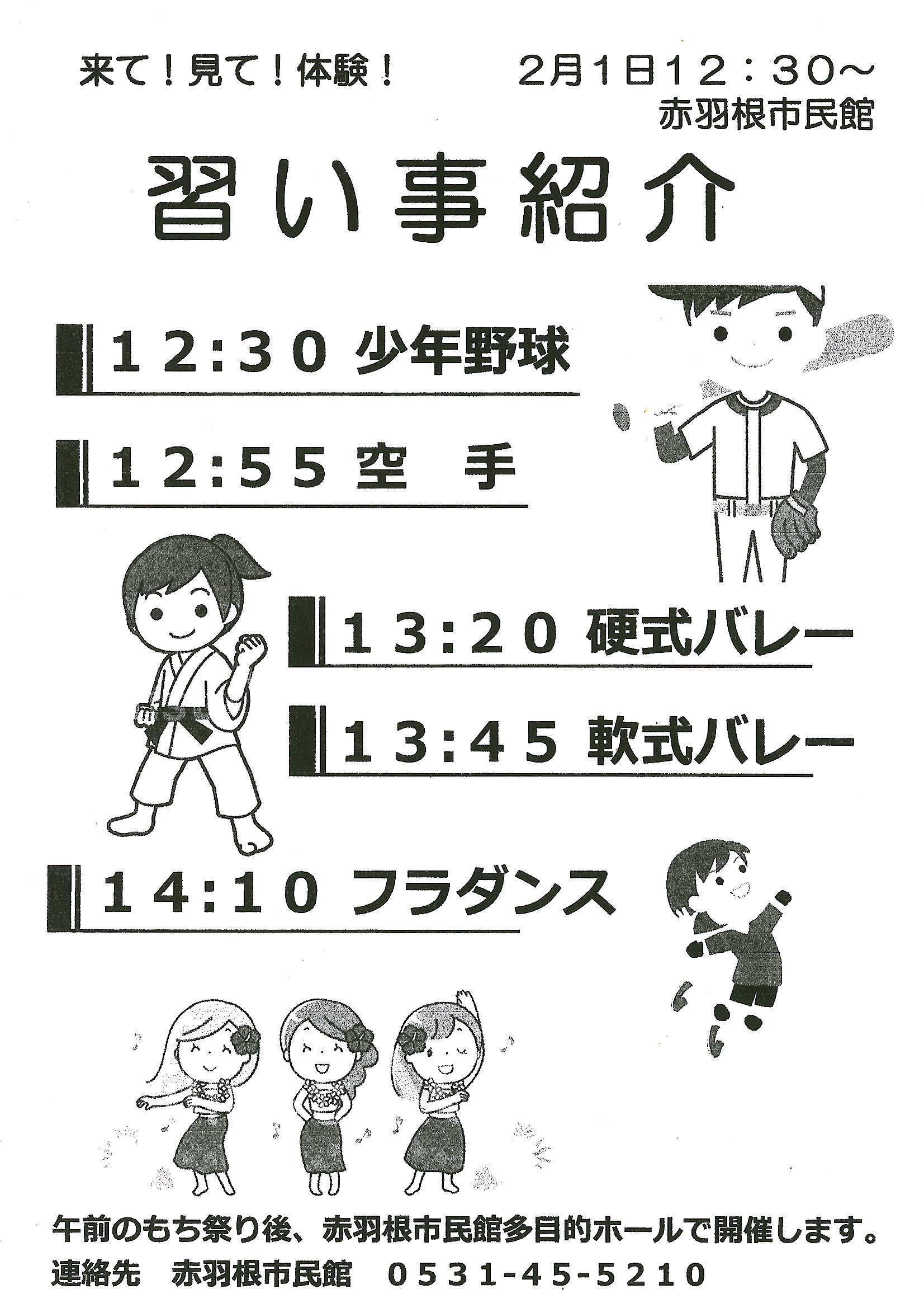赤羽根地区まちづくり推進委員会が主催する「赤羽根習い事紹介」のチラシです。2月1日(日)の餅祭の後に赤羽根市民館にて開催されます。 |