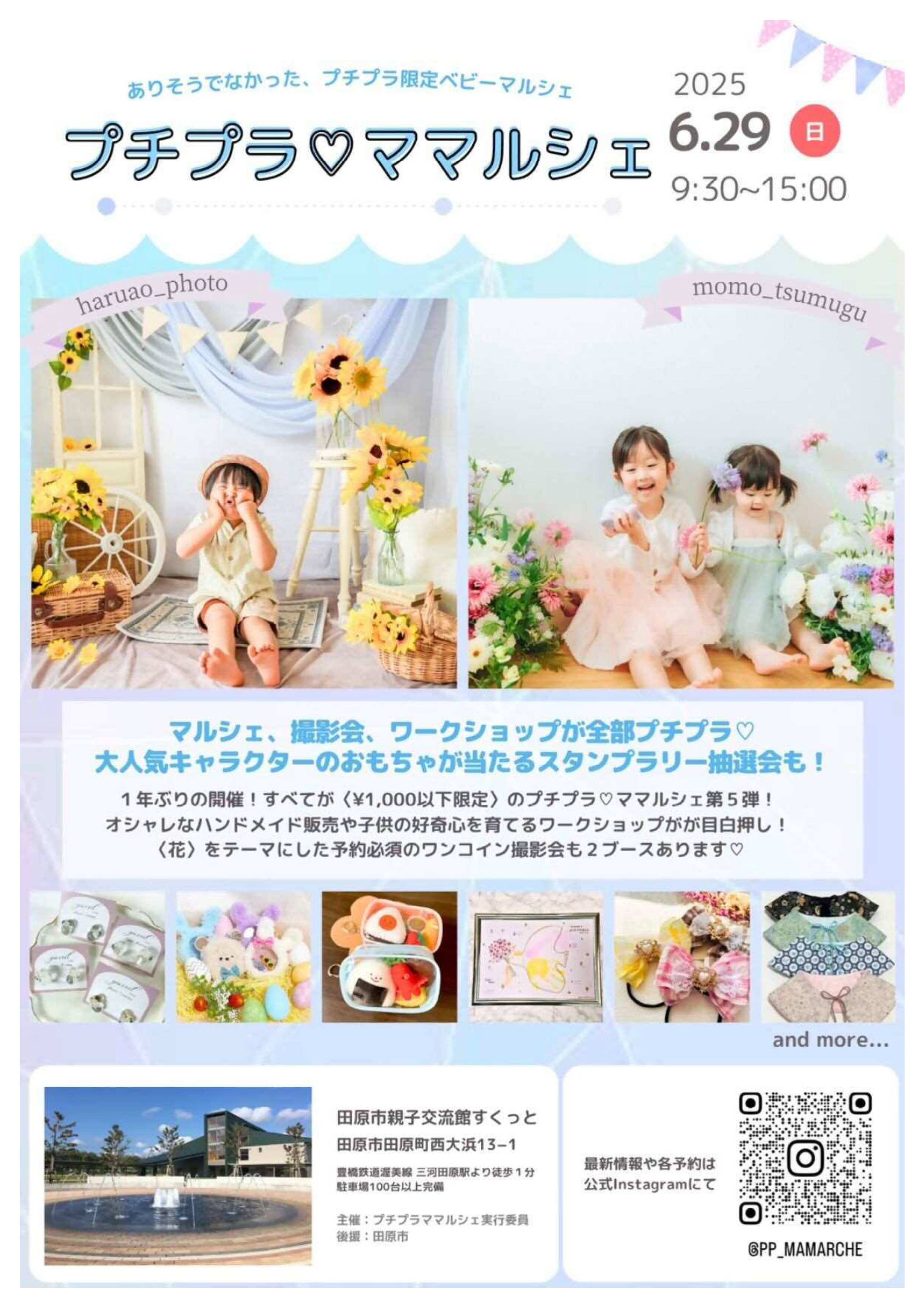 プチプラママルシェ実行委員が主催するプチプラママルシェのチラシです。田原市親子交流館すくっとにて6月29日(日)に開催されます。 |