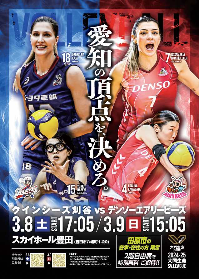 スカイホール豊田で開催されるバレーボールの試合観戦のチラシです。開催日は3月8日(土)、9日(日)です。 |