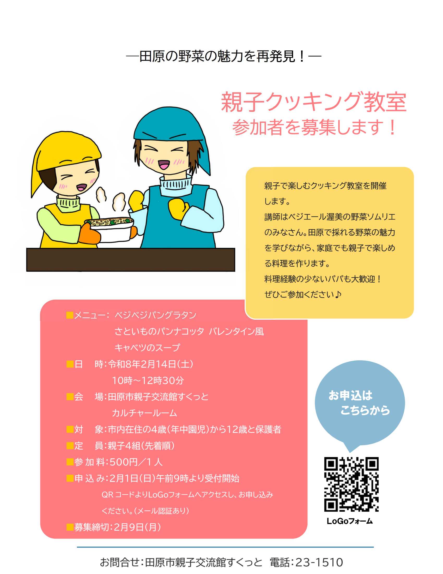 田原市親子交流館すくっとが主催する「親子クッキング教室」のチラシです。2月14日(土)にすくっとにて開催されます。