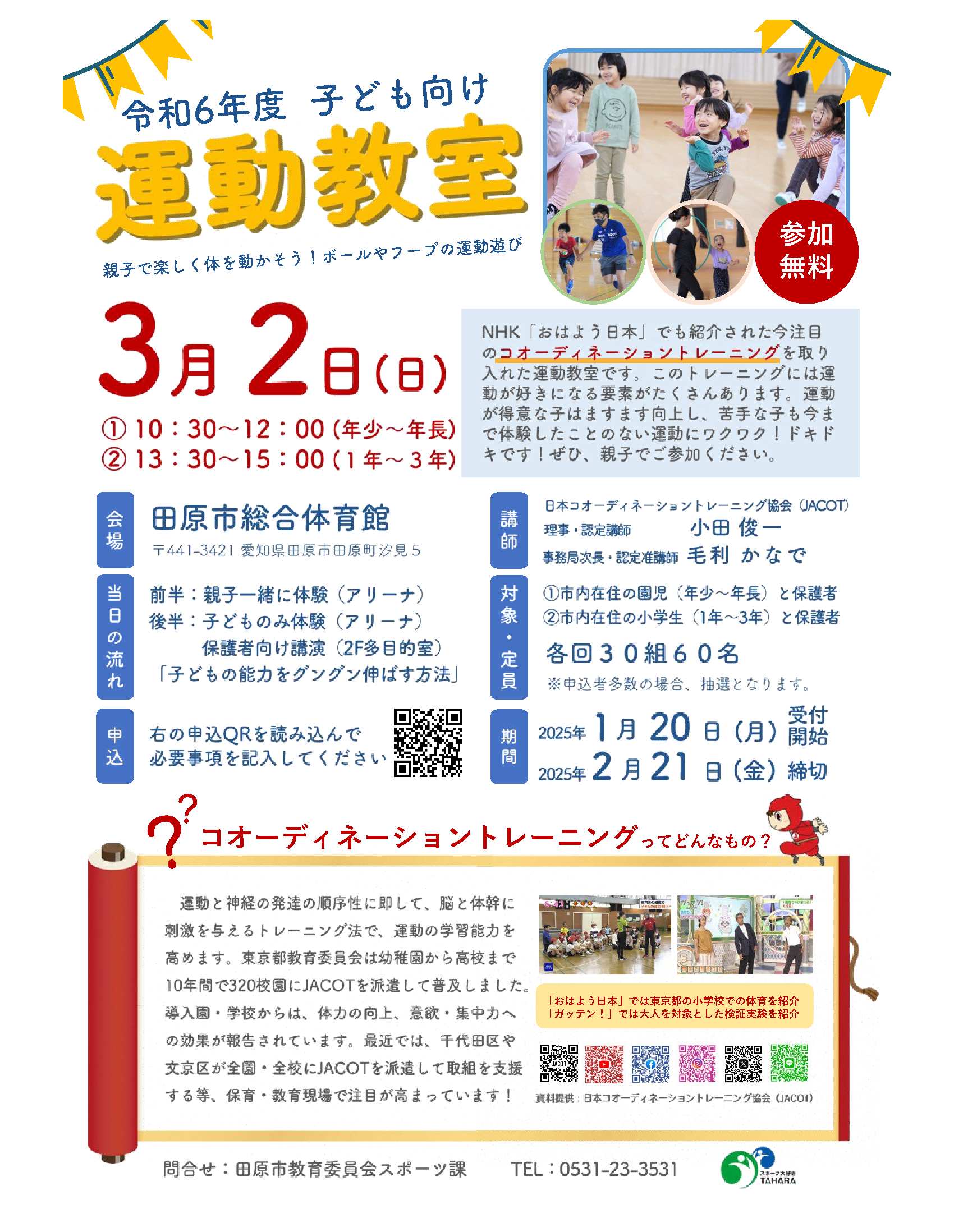 田原市教育委員会で3月2日(日)に「子ども向け運動教室」を開催します。 |