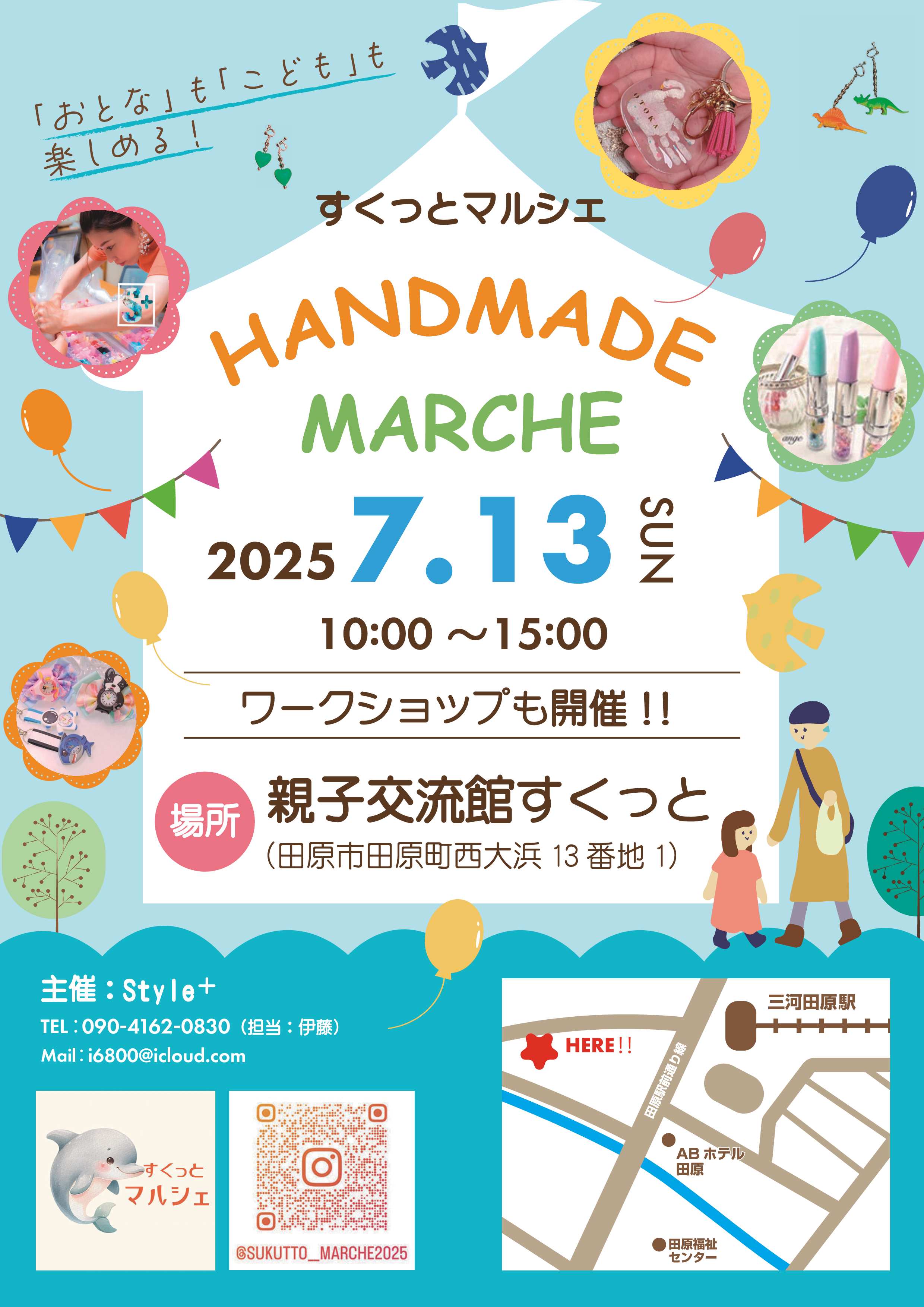 Style+が主催する「すくっとマルシェ」のチラシです。親子交流館すくっとにて7月13日(日)に開催されます。 |