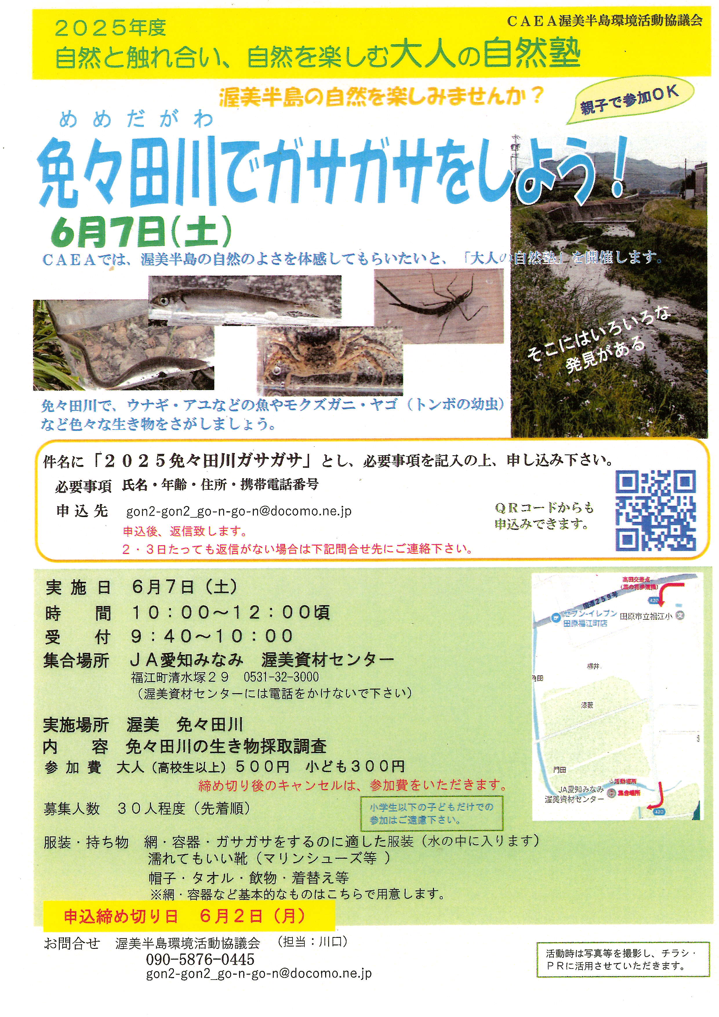 渥美半島環境活動協議会が主催する自然体験活動のチラシです。免々田川にて6月7日(土)に開催されます。 |