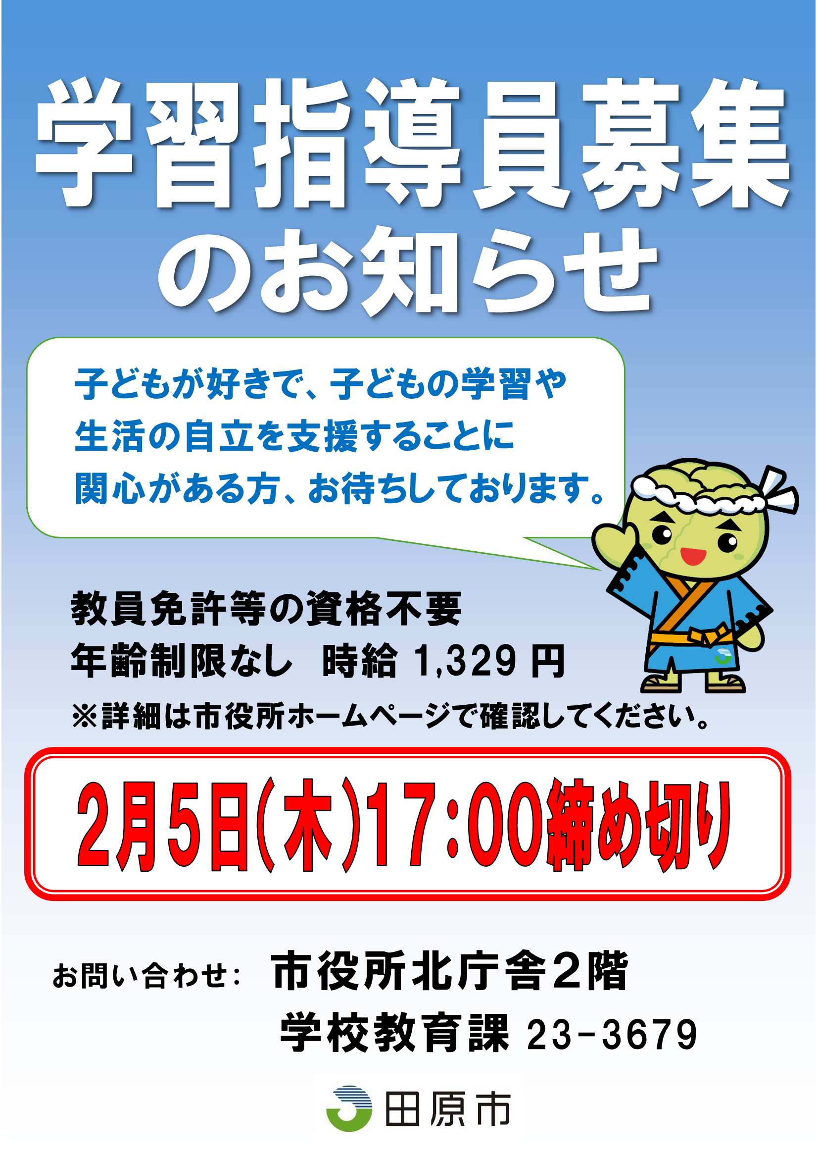 田原市教育委員会では「学習指導員」を募集しています。2月5日(木)受付締め切りです。詳しくは田原市役所ホームページをご覧ください。 |