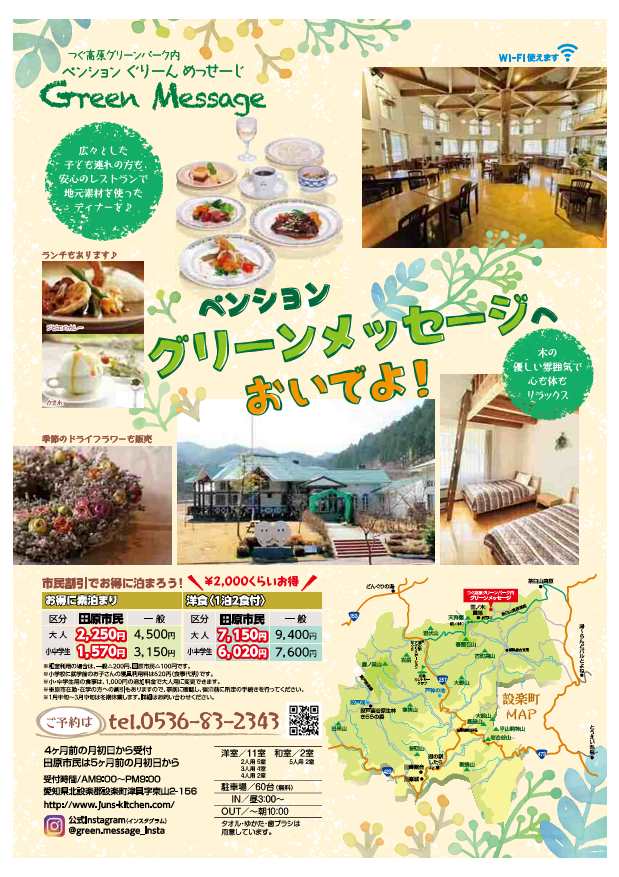 愛知県設楽町のつぐ高原グリーンパーク内にあるペンション、グリーンメッセージのチラシです。 |