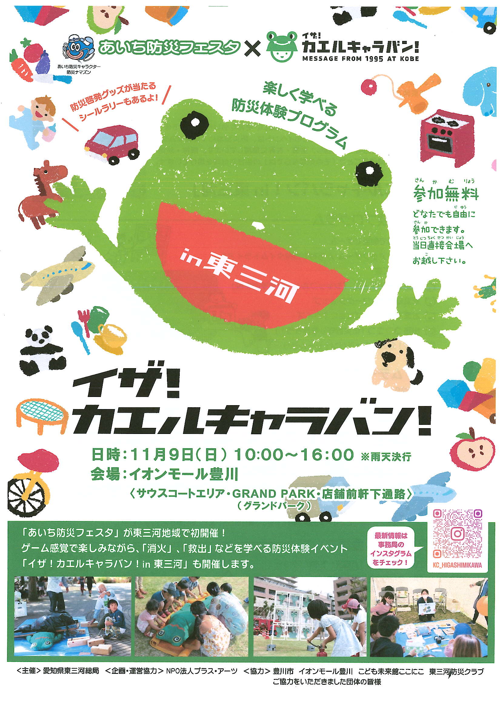 愛知県東三河総局が主催する「イザ!カエルキャラバン!」のチラシです。11月9日(日)にイオンモール豊川にて開催します。 |