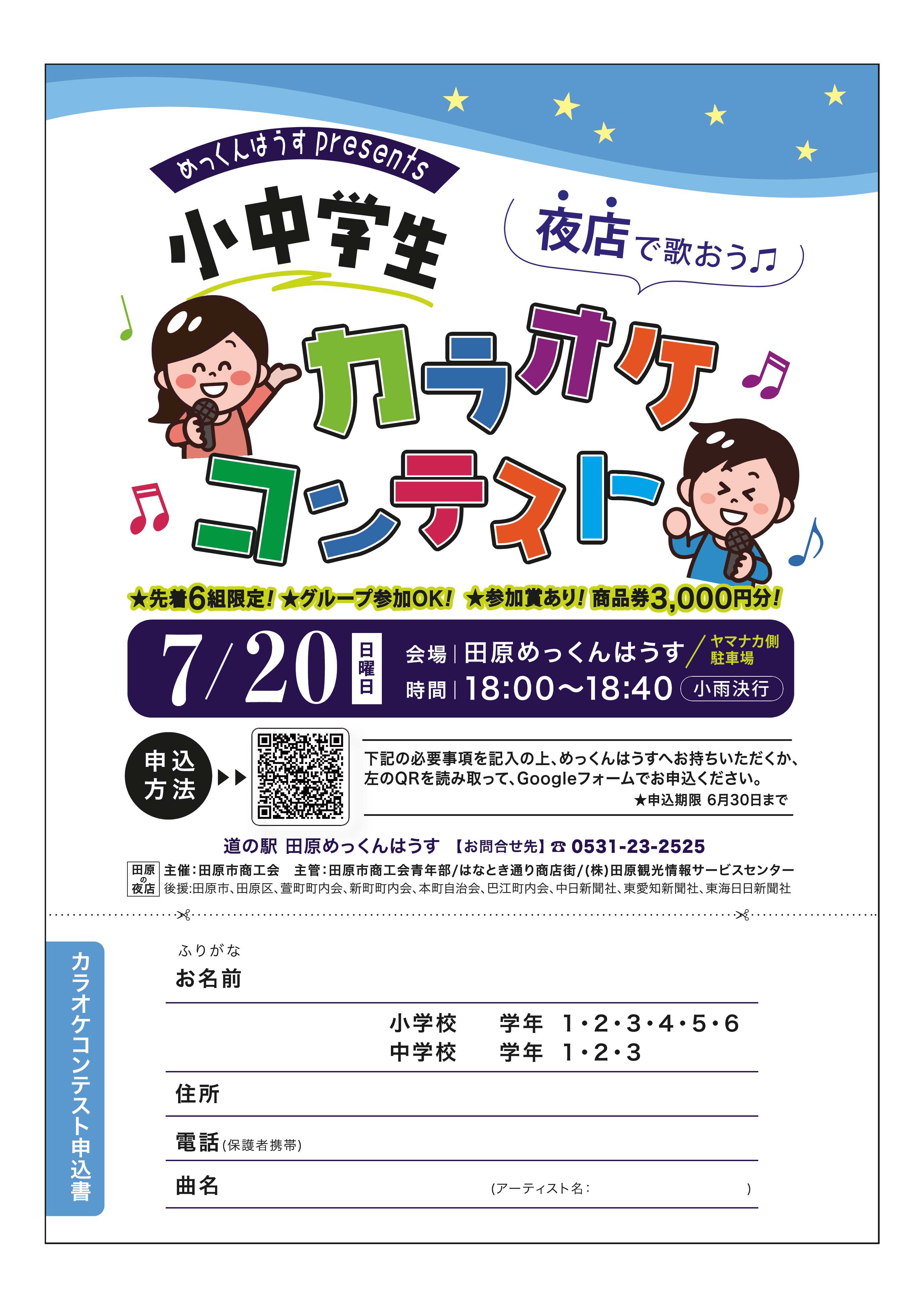 田原市商工会が主催する「小中学生カラオケコンテスト」のチラシです。田原めっくんはうすにて7月20日(日)に開催されます。 |