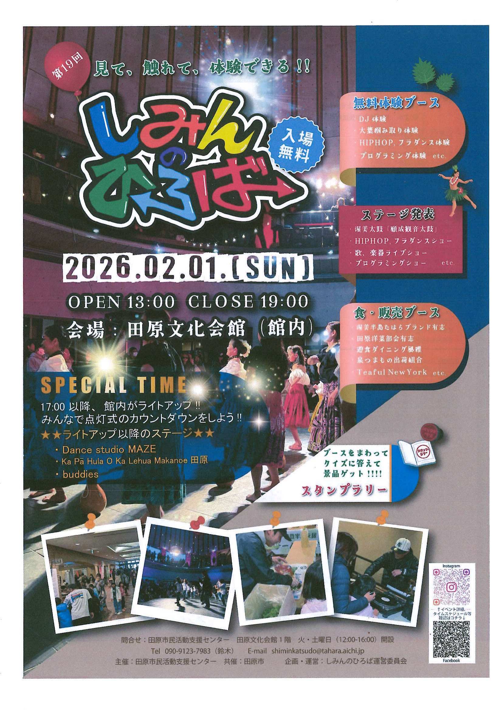 田原市民活動支援センターが主催する「しみんのひろば」のチラシです。2月1日(日)に田原文化会館にて開催されます。 |