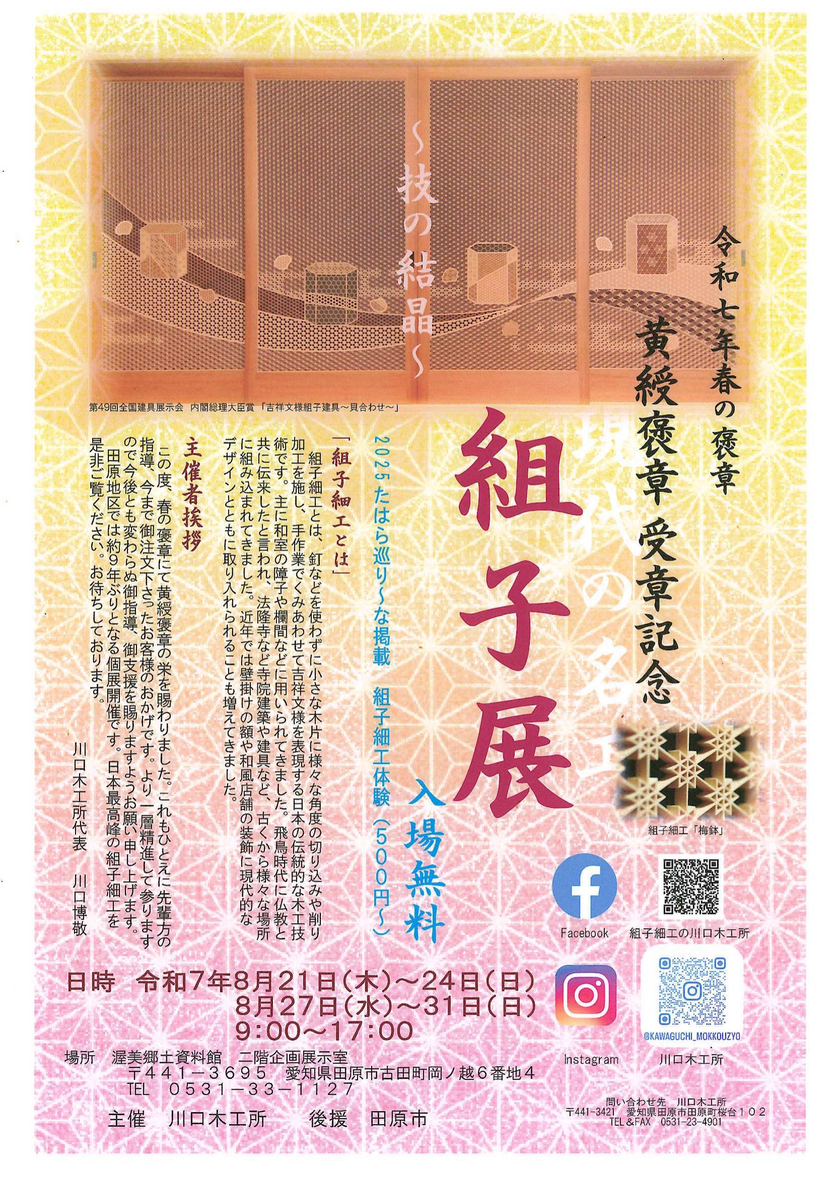 川口木工所が主催する「組子展」のチラシです。8月21日(木)から8月24日(日)、8月27日(水)~31日(日)に開催されます。
