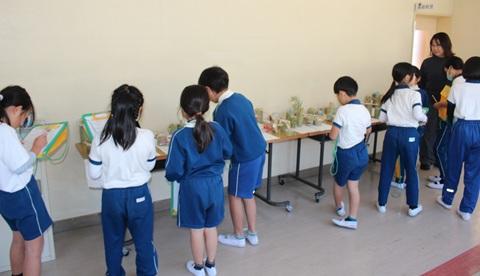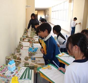 11月26日(水)午前、3年生の学級が、図工の授業で竹を使った作品の鑑賞会を行いました。1学期にグランドの南側の竹林から切り出してきた竹を使って、これまでにいろいろな作品を作ってきました。子どもたちは、輪の形から、長い棒の形などいろいろな形の竹を使って思い思いに作りました。友達の作品を見て感想を書いたり、発表したりしました。竹は様々な使い方ができておもしろいですね。