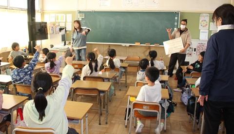 9月16日(火)午前、6年生が学級ごとに、三遠ネオフェニックスの元選手で「san-enアンバサダー」の方に来ていただいて、交流会を行いました。プロスポーツ選手の仕事や生活などのお話をしていただいた後、ハーフコートゲームをしました。子どもたちは、プロでプレーした選手の身長の高さ(2mの方もいました)やシュートやドリブルなどの技に圧倒されている様子でした。ぜひ、生で試合観戦をしたいと言っている子もいました。地元三河や遠州を本拠地とするチームです。応援して盛り上げていけるといいですね。