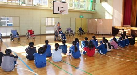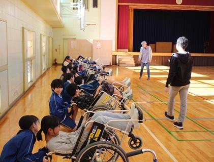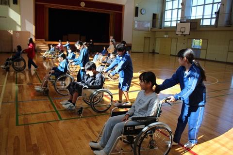 11月26日(水)午前、5年生が学級ごとに、福祉実践教室として、車椅子体験をしました。講師の方からは、車椅子に乗っている人の気持になって声をかけながら押すことが大切ですとお話がありました。下り坂や段差のある場所を車椅子で押す際にどんなことに気をつけるとよいかなど、具体的に教えていただきました。後ろ向きに引くことや斜めに傾けることは、やってみるとなかなか難しいようでした。車椅子の方と接する際にどうすればよいかを学ぶことができました。