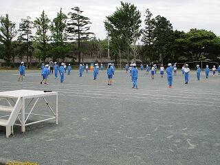 運動場を使用して本格的に運動会の練習が始まりました。今日は全校84名で昨日の体育館での縦割りの並び方を運動場で行いました。赤白に分かれて整列する練習です。団長や班長に続いてしっかり整列ができました。