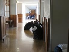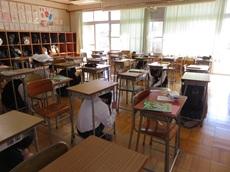 昼休みの時間に、地震を想定した避難訓練を行いました。事前に予告せず、各自の判断で避難行動がとれるかどうかの訓練でした。休み時間で気が緩んでいるときに緊急地震速報が流れましたが、教室にいた生徒は速やに机の下にもぐり、廊下にいた生徒は低い姿勢で次の指示を待つことができました。今回は、不明者2名がいる状況も設定しました。このことは、先生たちにも事前に知らせていませんでしたので、不明者の捜索やけがへの対応など、先生たちの訓練にもなりました。