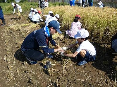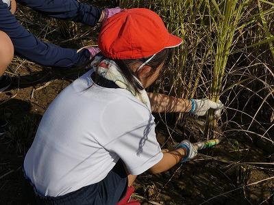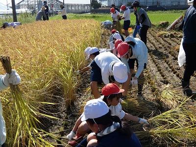 稲刈りは、4年生児童がお手伝いに加わり、みんなでがんばりました。