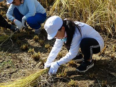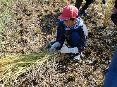 刈り取った稲は束にして、自分たちでわらから作ったすがいで解けないようしっかり縛りました。