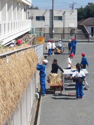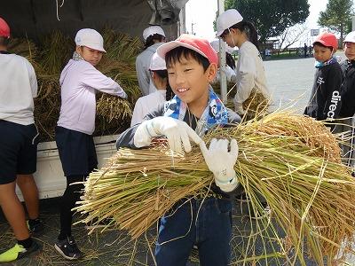 9月16日4年生・5年生児童が稲刈りへ、そして、午後から5年生は脱穀を行いました。