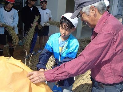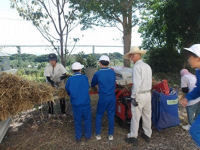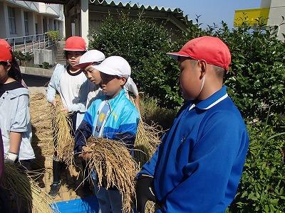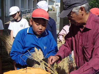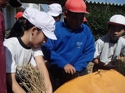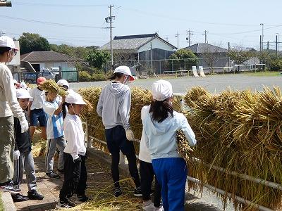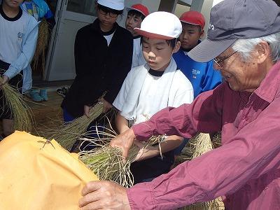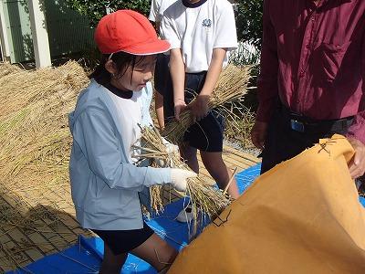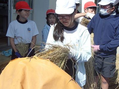 9月26日 4・5・6年生児童が、地域の永田さんに教えていただき、稲の脱穀を行いました。