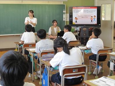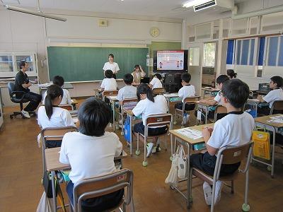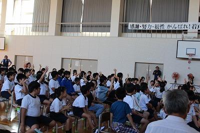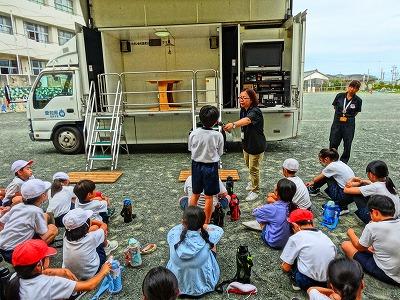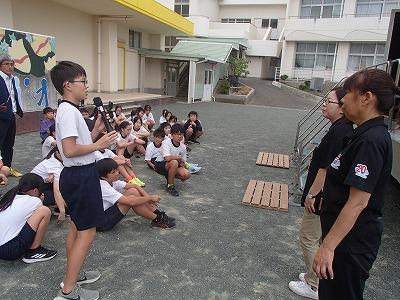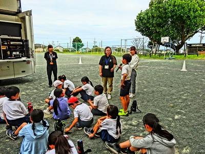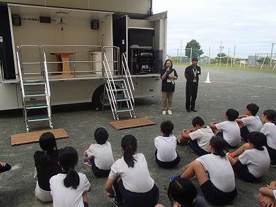 9月24日 市役所 防災対策課の方々をお招きして、3〜6年生が防災教室・地震体験車試乗体験を行いました。