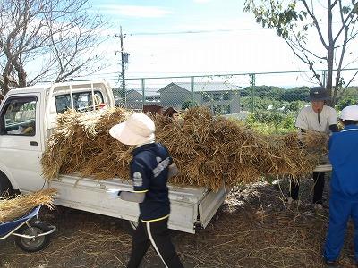 みんなで協力して刈り取った稲は、トラックで学校まで運ばれ、干しました。