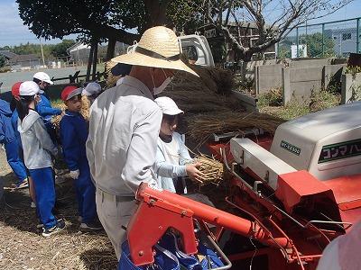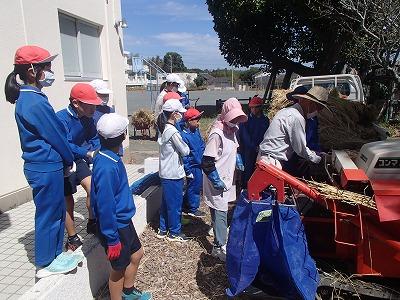 午後、5年生児童は、地域の方に足踏み脱穀機等を使った昔の技法を教えて頂き脱穀体験をしました。