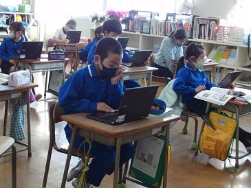 3年生の社会科でも個人パソコンを使って学習すすめていました。